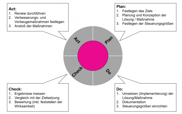 Die obligatorischen Bestandteile des TC ISMS, die sichere Technik und Infrastruktur, die Sicherheitsorganisation, die Sicherheitsprozesse, sowie die Sicherheitsdokumentation werden im Rahmen eines aktiven Plan-Do-Check-Act-Verfahrens permanent überprüft und kontinuierlich verbessert.