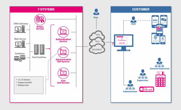 Every user of the system is provided with a so-called token (authentication medium). This token generates the one-time password. It can be operated offline, i.e. without connection to a computer. The user uses the standard login mask of the target application known to him. Here he enters his user ID and the one-time password generated by the token. OneTimePass checks the one-time password and sends the result of the check back to the server or the server application. Communication takes place via the standard RADIUS protocol or SOAP.